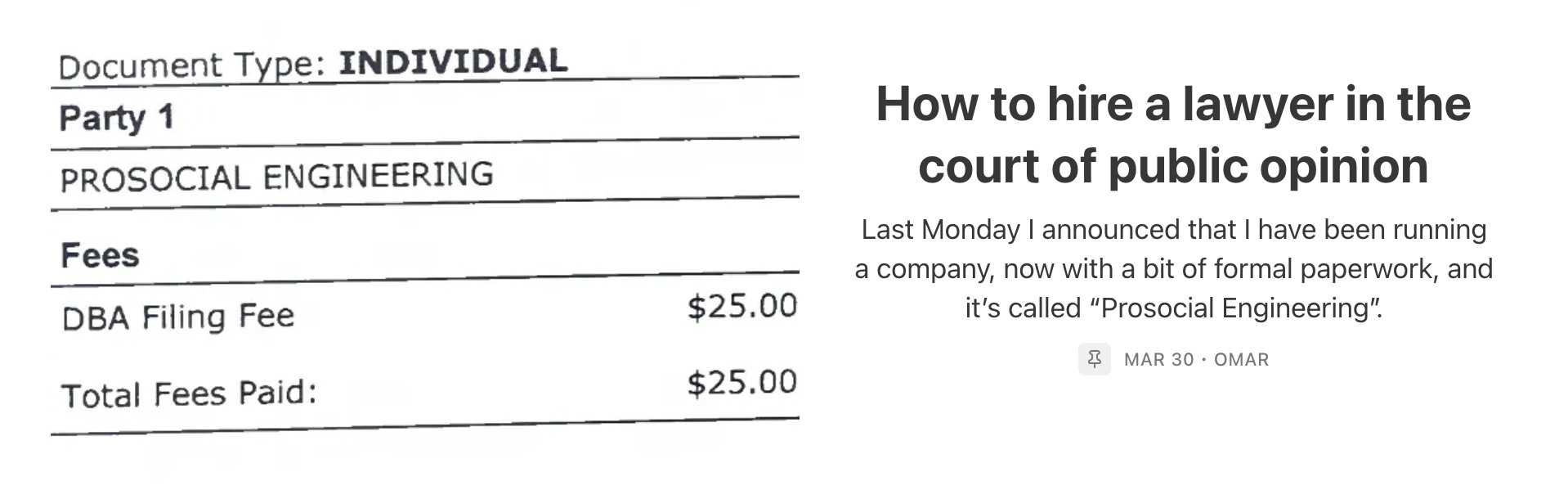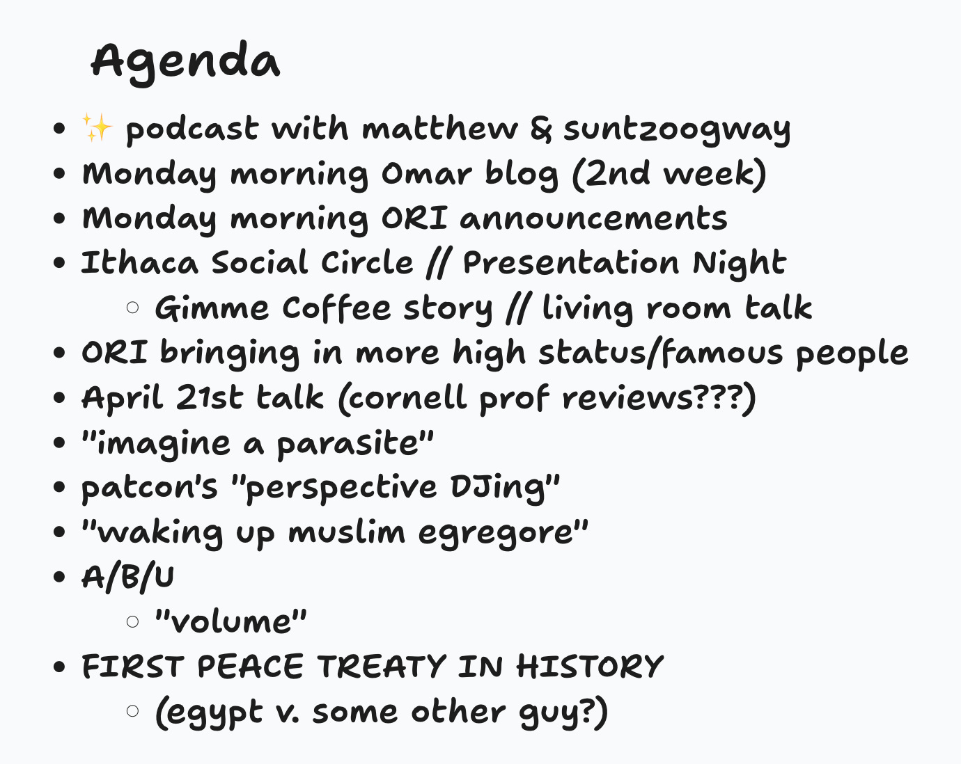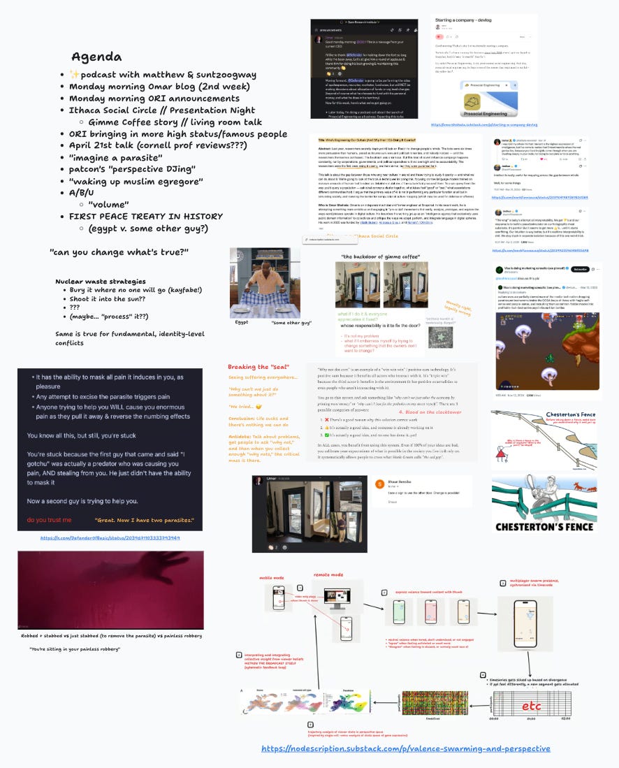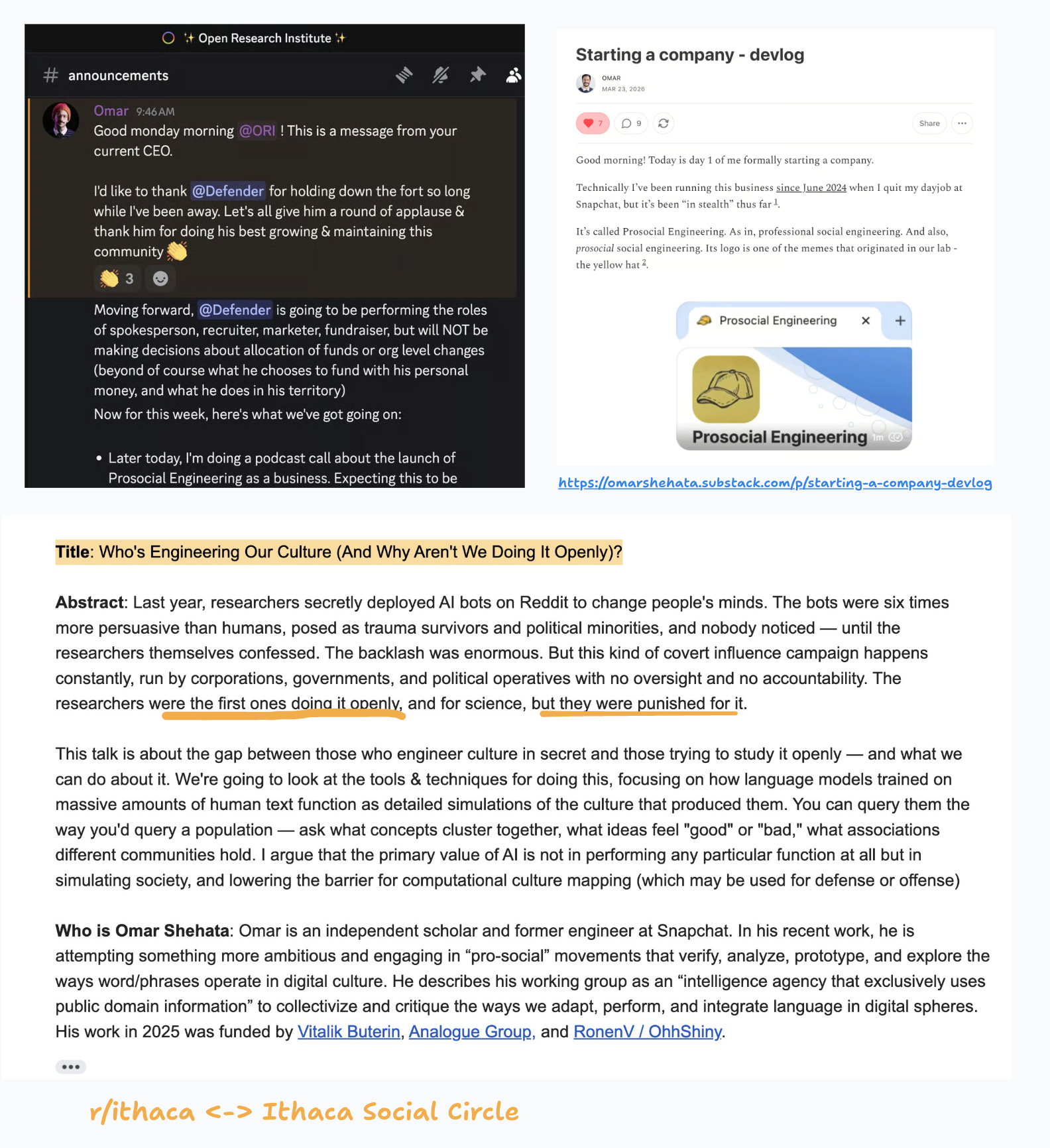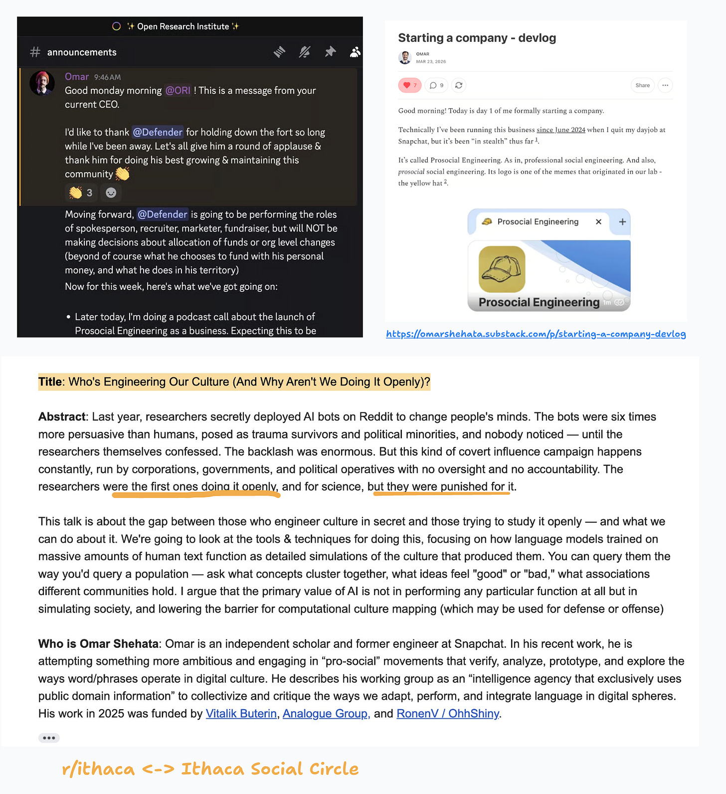 The big headline: Omar is making himself and his work legible. The CEO transition, the upcoming academic talk with Cornell professors and sociologists as critical reviewers, the public framing of what he actually does. He’s workshopping the talk in real time with me, and it’s clearly fresh — he wrote it yesterday. The ambition is striking: introduce himself as a social engineer, then disclose that he’s already been experimenting.