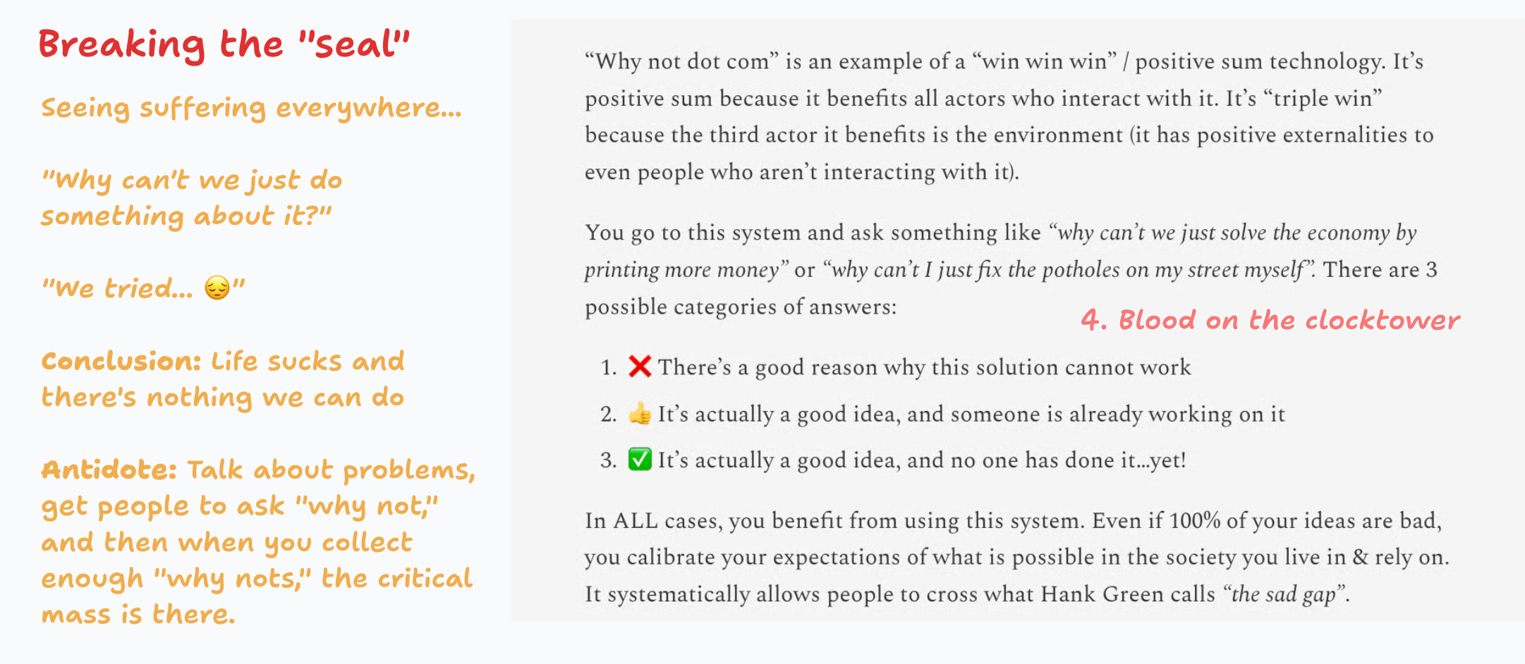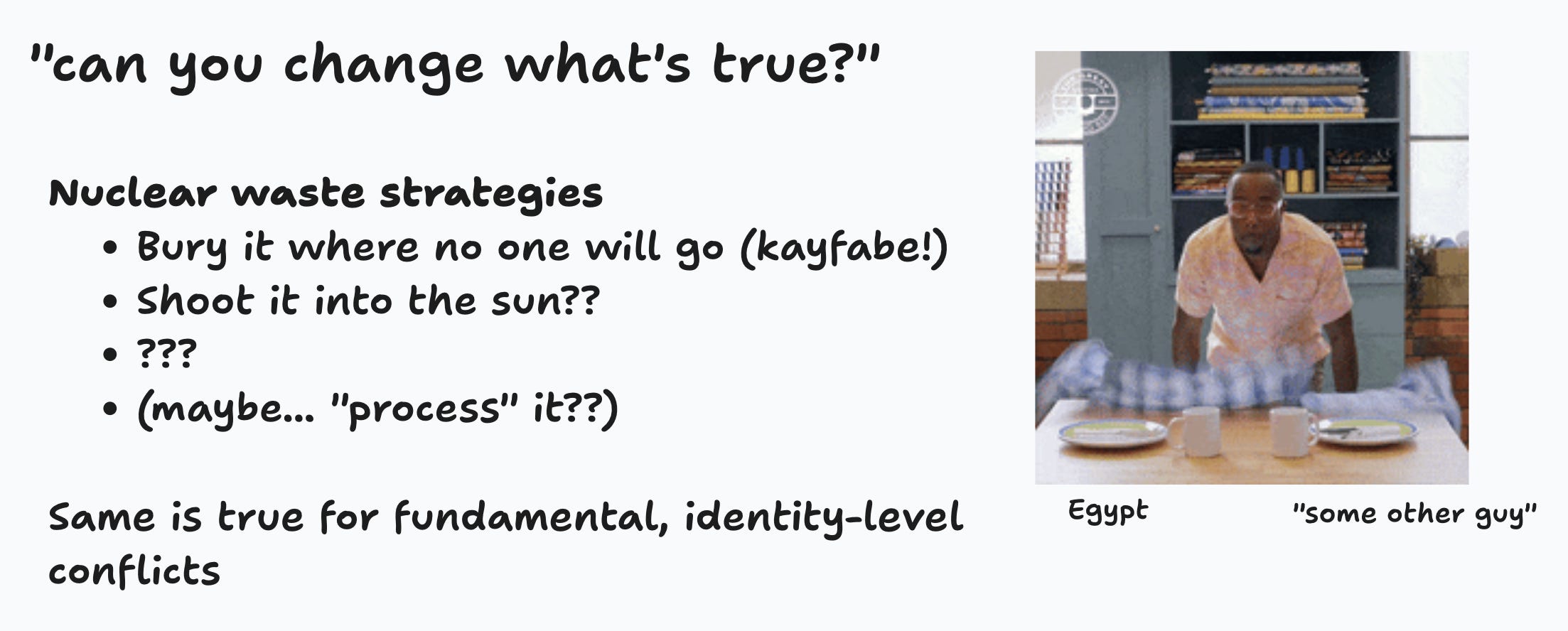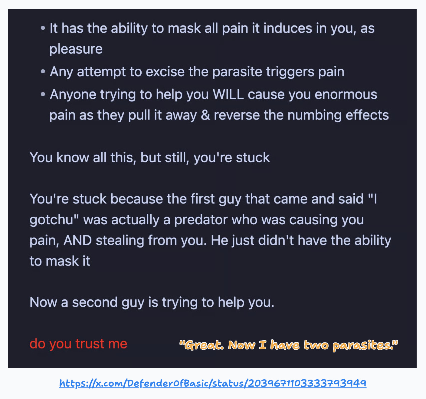 The parasite metaphor. Omar lays out three states: painless robbery (you’re being exploited but it feels fine), robbery plus stabbing (exploited and it hurts), and just stabbing — which is the pain of having the parasite removed. The problem is you can’t tell the difference between helpful pain and harmful pain from the outside. I land on “robbery blind spot” — if you’ve never felt the robbery, you can’t distinguish the surgeon from the mugger. Omar ties it to Blood on the Clocktower: you’ve figured out who’s lying, but nobody else has your clarity, and telling them doesn’t automatically give it to them.