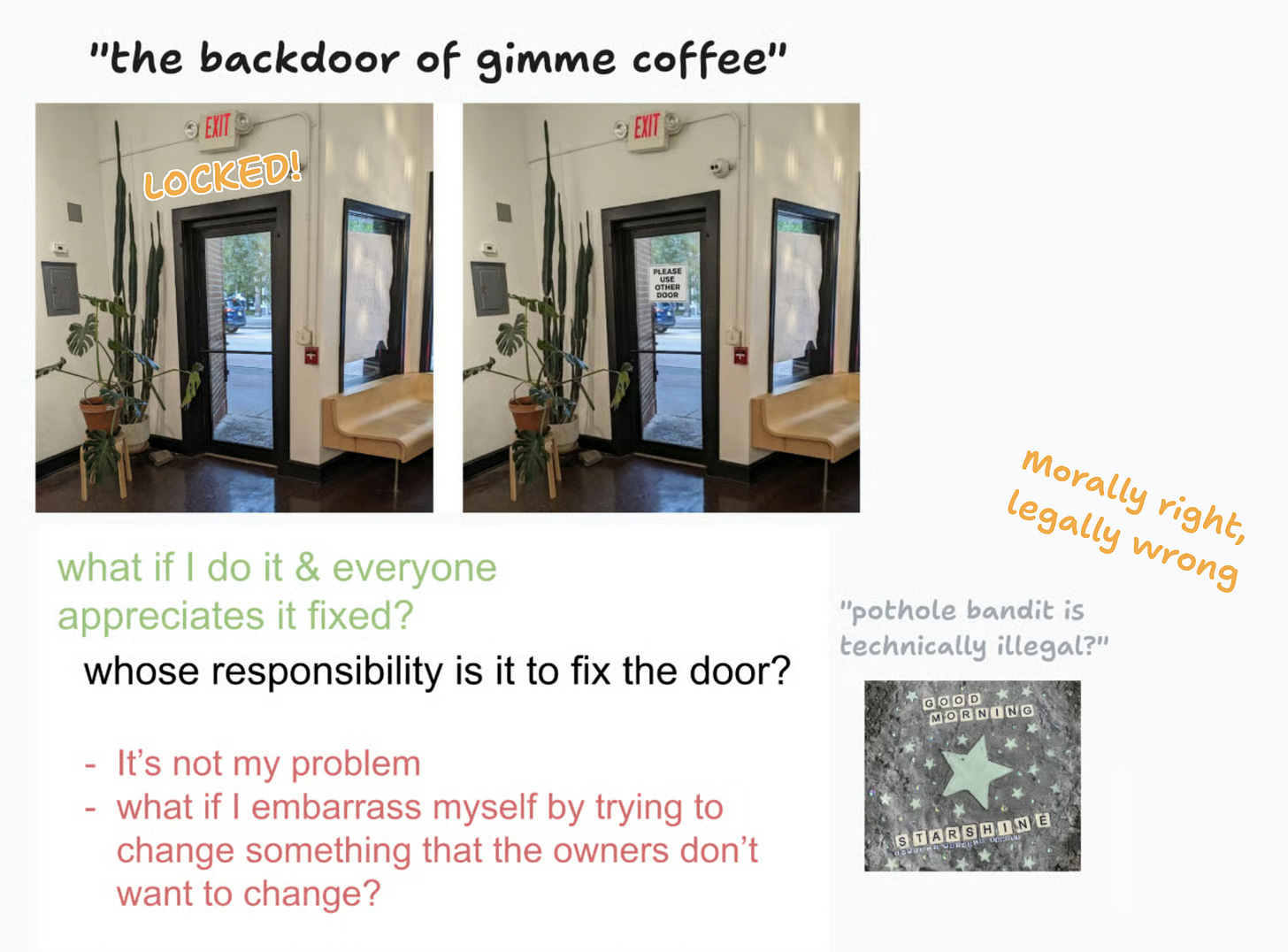 The centerpiece. Omar tells the story of a locked door at a coffee shop he’s watched people struggle with for a year. He gave a public talk about it, got called out on stage for not just talking to the staff himself, absorbed the criticism, then systematically tested every communication channel — baristas, managers, board members, corporate email — to map how information flows (and doesn’t) through the organization. A sign eventually appeared. He photographed himself next to it like a trophy. People around town were moved by it, which is kind of beautiful and kind of absurd for a door sign. Then an old man at a bakery interrupted the retelling to say the coffee shop was lying — he’d reported the same problem a year ago and nothing happened. The layers just keep going.